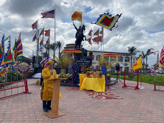Mờ sáng trời mưa lâm râm nhưng may quá đến khoảng trưa thì nắng lên. Bác sĩ Hội trưởng Nguyễn Chí Vỹ, đọc diễn văn chào mừng quan khách và đồng hương. Vang lên bài văn tế ca ngợi công đức và chiến công của Vua Quang Trung, các nhân sĩ cộng đồng thắp hương trước bàn thờ. Các dân cử gốc Việt như Nghị sĩ California Janet Nguyễn, Thị trưởng Westminster Nguyễn Mạnh Chí, cùng Nghị viên Kimberly Hồ, Nghị viên Thái Việt Phan của thành phố Santa Ana… phát biểu và tặng bằng khen cho Ban tổ chức.