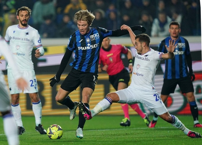 Cầu thủ Sampdoria nỗ lực năn một cú dứt điểm của đối phương trong trận thua 0-2 trên sân Atalanta ngày 29/1 - một ngày trước khi vụ thư nặc danh gửi tới đe doạ ban lãnh đạo. Ảnh: Lega Serie A