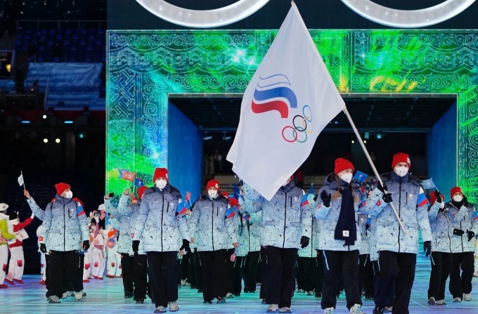 Vận động viên Nga mang cờ của Ủy ban Olympic Nga thay cho quốc kỳ khi tham dự Olympic Mùa Đông ở Bắc Kinh vào tháng 2/2021. Ảnh: AP.