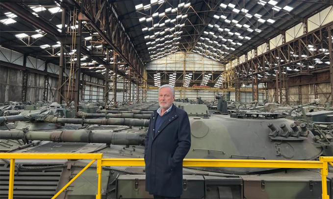 Lãnh đạo công ty OIP Freddy Versluys đứng trước xe tăng Leopard 1 trong kho tại ngoại ô thành phố Tournai, Bỉ ngày 31/1. Ảnh: Guardian.