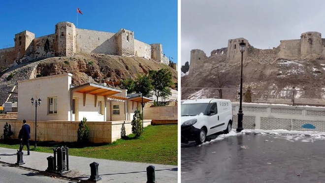 Lâu đài Gaziantep trước và sau trận động đất. Ảnh: Reuters.