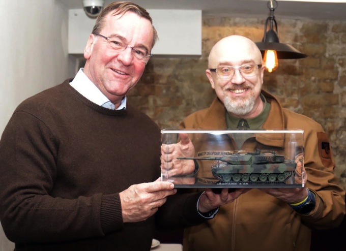 Bộ trưởng Quốc phòng Ukraine Oleksiy Reznikov hôm 7/2 đăng Twitter bức ảnh chụp cùng Bộ trưởng Quốc phòng Đức Boris Pistorius, trong tay cầm mô hình của chiếc xe tăng Leopard. "Cảm ơn đồng nghiệp của tôi, Boris Pistorius, và những người dân Đức. Liên minh xe tăng sẽ đi tới chiến thắng", ông Reznikov viết.