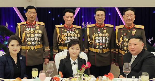 Trong bức ảnh do truyền thông nhà nước Triều Tiên công bố, cô bé Ju-ae - được cho là người con thứ hai của ông Kim Jong-un - ngồi giữa cha và mẹ của mình trong bàn tiệc.