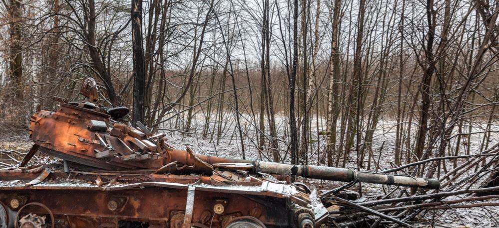 Một chiếc xe tăng bị phá huỷ ở làng Kuhari, ngoại ô thủ đô Kiev của Ukraine. (Ảnh: Getty)