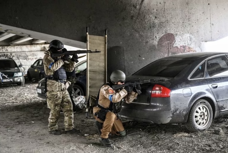 Binh sĩ Ukraine chiến đấu ở thành phố Irpin, phía tây bắc Kiev hôm 13/3/2022, ở giai đoạn đầu của cuộc xung đột.