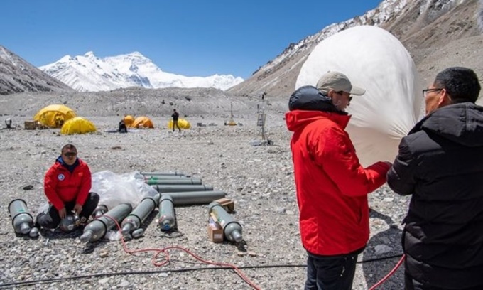Các nhà nghiên cứu do Trung Quốc dẫn đầu chuẩn bị thả khí cầu hồi tháng 5 năm ngoái dọc biên giới Trung Quốc - Nepal. Ảnh: Zuma Press.