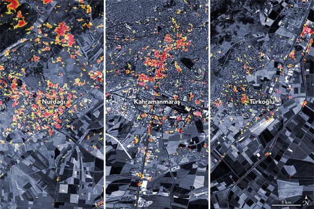 Theo bản đồ vệ tinh cho thấy sơ bộ về mức độ thiệt hại một phần của các thành phố Türkoğlu, Kahramanmaraş và Nurdaği của Thổ Nhĩ Kỳ. Trong đó, các pixel có màu đỏ đậm biểu thị những khu vực có nhà cửa, cơ sở hạ tầng bị hư hại nghiêm trọng, hoặc làm thay đổi cảnh quan. Ngoài ra, các khu vực có màu cam và màu vàng th́ bị tàn phá ở mức vừa phải hoặc một phần. Trên thực tế, mỗi pixel đại diện cho một không gian có kích thước khoảng 30 m, gần bằng diện tích sân bóng chày.