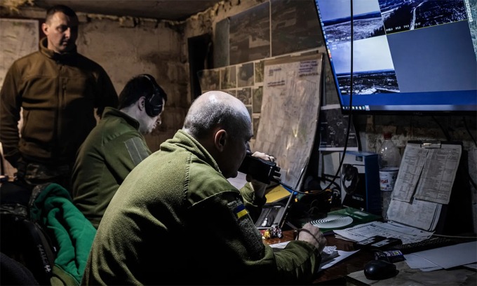 Binh sĩ Ukraine theo dõi tình hình chiến trường qua hình ảnh từ UAV ở ngoại ô thành phố Ugledar ngày 14/2. Ảnh: Guardian.