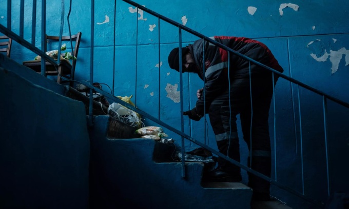 Buổi trưa, Vitaliy Sytnyk, 55 tuổi, tranh thủ nghỉ ngơi tại Bệnh viện Trung tâm Avdiivka, sau nhiều ngày mất ngủ. Ông cho hay hầu hết nhân viên bệnh viện đă rời đi vào năm ngoái v́ bị pháo kích dữ dội. Ông là bác sĩ duy nhất c̣n lại tại đây từ tháng 10.