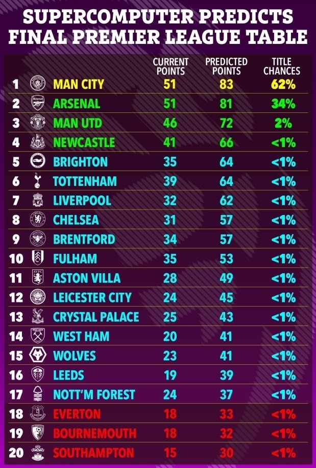 Newcastle được dự đoán sẽ cán đích thứ tư và giành vé cuối dự Champions League. Xếp sau lần lượt là Brighton, Tottenham và Liverpool. Trong khi đó, Chelsea - CLB chi tổng cộng 668 triệu USD để mang về 16 cầu thủ qua hai kỳ chuyển nhượng gần nhất - được cho sẽ cán đích thứ tám với 57 điểm, bằng Brentford. "The Blues" cũng chỉ có 5% cơ hội giành suất dự Champions League mùa tới thông qua giải quốc nội.