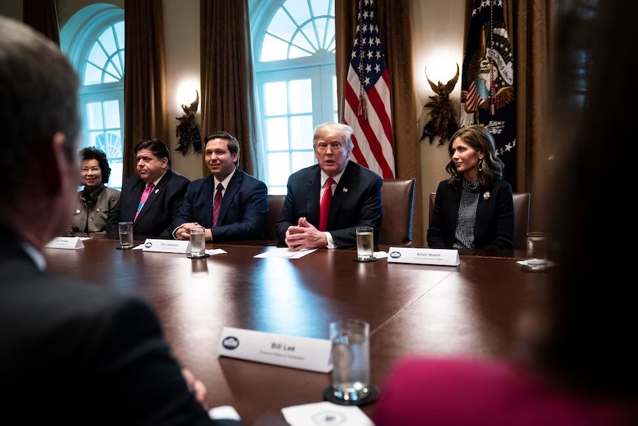 Ông DeSantis lắng nghe ông Trump phát biểu trong cuộc gặp với các thống đốc đắc cử tại Nhà Trắng năm 2018. Ảnh: Washington Post.