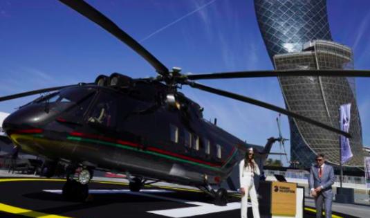 Nhân viên bán hàng Nga đứng cạnh một chiếc trực thăng do Công ty Trực thăng Nga sản xuất tại Hội nghị và Triển lãm Quốc phòng Quốc tế ở Abu Dhabi, Các Tiểu vương quốc Ả Rập Thống nhất ngày 20/2. Ngay bên ngoài hội chợ vũ khí hai năm một lần ở Abu Dhabi, Nga đã bán vũ khí cho các đối tác, từ súng trường tấn công Kalashnikov đến hệ thống tên lửa mặc dù phải đối mặt với các lệnh trừng phạt từ phương Tây trong cuộc chiến với Ukraine. Ảnh AP