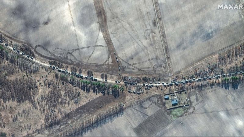 Theo như ngay buổi sáng hôm đó ở Bucha, phía bắc Kyiv, có người đàn ông đang đứng bên ngoài một siêu thị khi hơn 100 chiếc xe quân sự Nga tiến vào thị trấn, ba ngày sau cuộc xâm lược Ukraine của Nga, một đoàn xe bọc thép khổng lồ dài 15,5 km đã được một vệ tinh phát hiện như sự khởi đầu kế hoạch chiếm thủ đô và loại bỏ chính phủ Ukraine của Tổng thống Vladimir Putin.