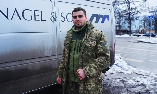 Người lính Ukraine Oleh Bendyk đứng trước chiếc xe tải của anh ấy ở Kramatorsk. Ảnh: Christopher Cherry/The Guardian