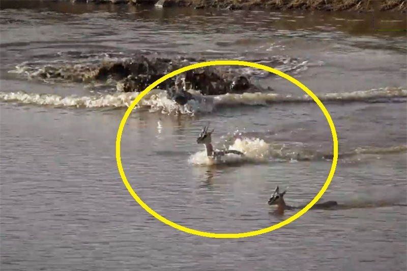 Do ở môi trường nước quen thuộc nên cá sấu dễ dàng bắt kịp và tóm gọn linh dương Gazelle. Trong cuộc vượt sông này, có 2 con linh dương phải bỏ mạng.