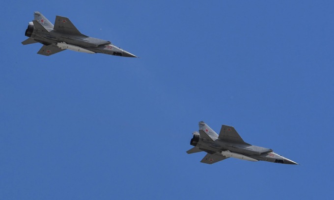 Tiêm kích MiG-31K mang tên lửa Kinzhal bay trên Quảng trường Đỏ ở Moskva tháng 5/2018. Ảnh: AFP.