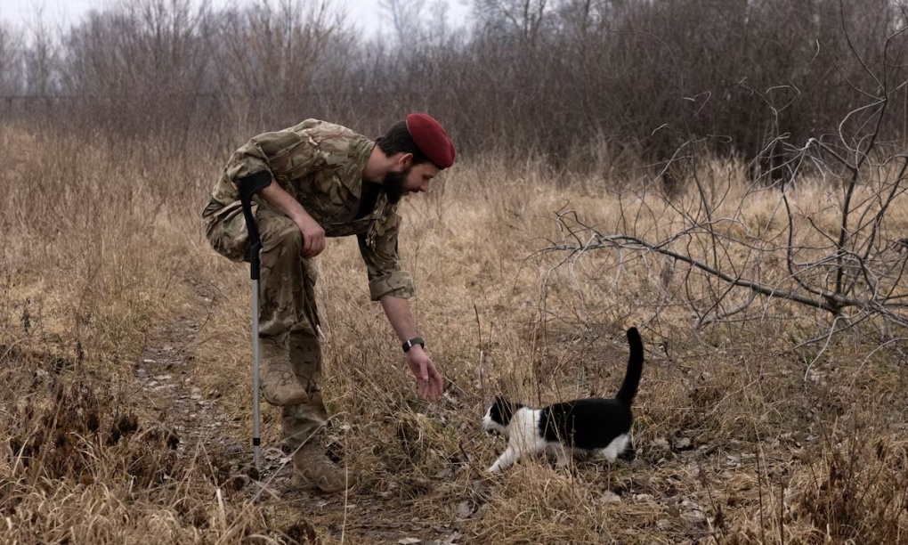 Một binh sĩ Ukraine chơi đùa cùng mèo hoang khi đang điều trị tâm lý (ảnh: Washington Post)