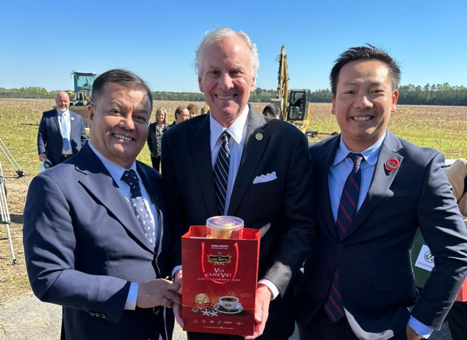 Lễ động thổ nhà máy đắp lốp và tái chế lốp xe của King Coffee tại tiểu bang Nam Carolina, Mỹ hôm 14/3, có sự chứng kiến của ông Nguyễn Quốc Dũng - Đại sứ Việt Nam tại Mỹ và thống đốc bang, nghị sỹ cùng nhiều lãnh đạo của bang Nam Carolina.