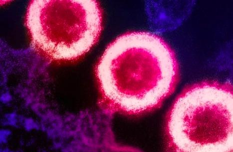 Hình ảnh dưới kính hiển vi này cho thấy các hạt virus HIV-1 (màu hồng) đang nhân lên từ màng tế bào miễn dịch bị nhiễm bệnh (màu tím).