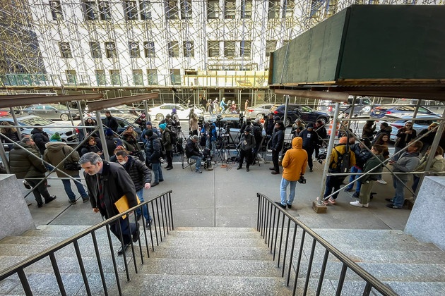 Phóng viên tụ tập trước cửa Tòa án Hình sự quận Manhattan vào hôm 20/3. Ảnh: Politico.