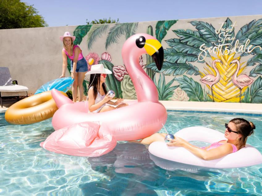 Bể bơi vô cực trong xanh lấp lánh, những quả bóng bay chữ cái màu hồng nổi bật. Hai chàng trai thân hình to cao, vạm vỡ được thuê giá khoảng 500 USD/người trong 2 giờ để phục vụ bia rượu cho khách mời, theo Nytimes.