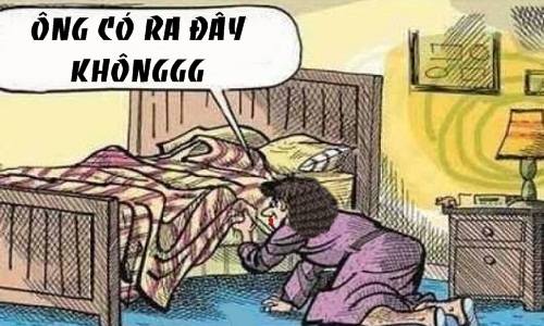 Hôm đó Tèo đi nhậu đến tối mịt, vừa nghe tiếng vợ léo nhéo, chàng ta đã vội vàng rúc xuống gầm giường. Vợ Tèo bực mình cầm cây chổi quát: