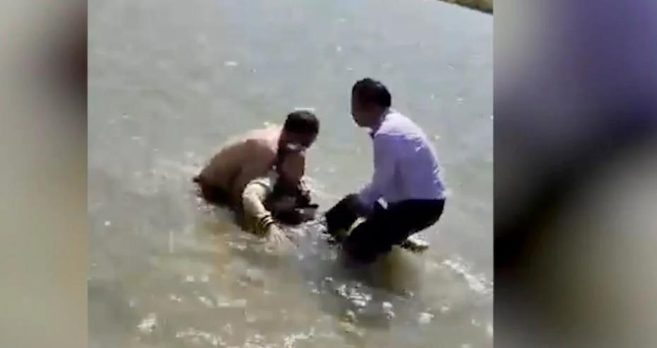 Trong video đang lan truyền rộng rãi trên mạng xã hội Trung Quốc, cô dâu họ Tôn cùng chú rể tuần trước chụp ảnh cưới tại thành phố Phụ Dương, tỉnh An Huy, miền đông nước này thì bất ngờ phát hiện một thiếu nữ đang vùng vẫy dưới hồ nước gần đó.