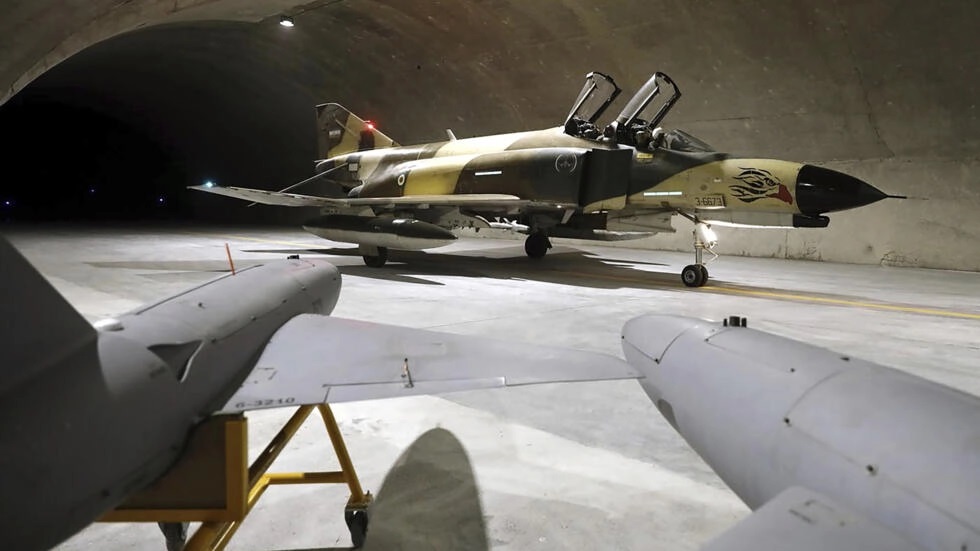 Ảnh minh họa được đăng trên trang web của Quân đội Iran hôm 07/02/2023, một chiến đấu cơ đang lăn bánh và hai drone ở hầm Oghab-44 hoặc Eagle-44 của một căn cứ không quân không rơ địa điểm tại Iran. AP