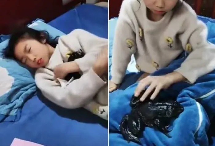 Cụ thể, con gái cô đang ôm một con ếch trâu còn sống đi ngủ. Con ếch to bằng 2 bàn tay bé gộp lại, đen thùi lùi, miệng vẫn đang không ngừng kêu.