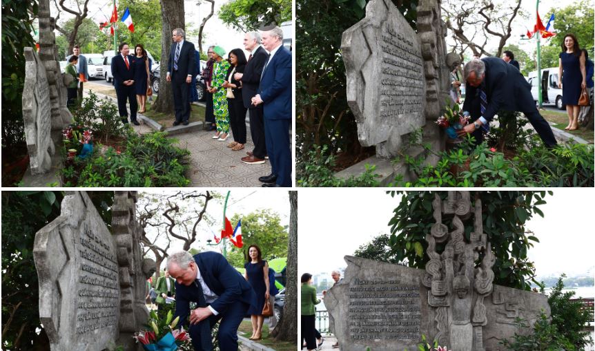 Đoàn nghị sĩ lắng nghe Đại sứ Mỹ tại Việt Nam Marc Knapper thuyết minh về tấm bia. Thượng nghị sĩ Jeff Merkley và Chris Van Hollen sau đó lần lượt đặt hoa tưởng niệm.