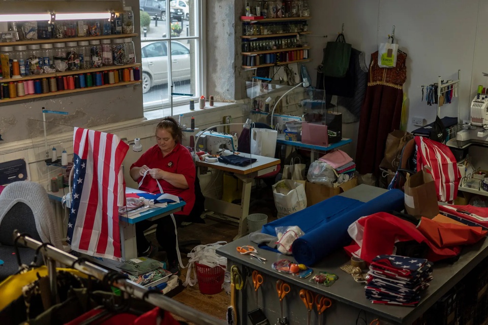 Một phụ nữ ở Ireland đang may cờ Mỹ trước chuyến thăm của ông Biden. Ảnh: New York Times.