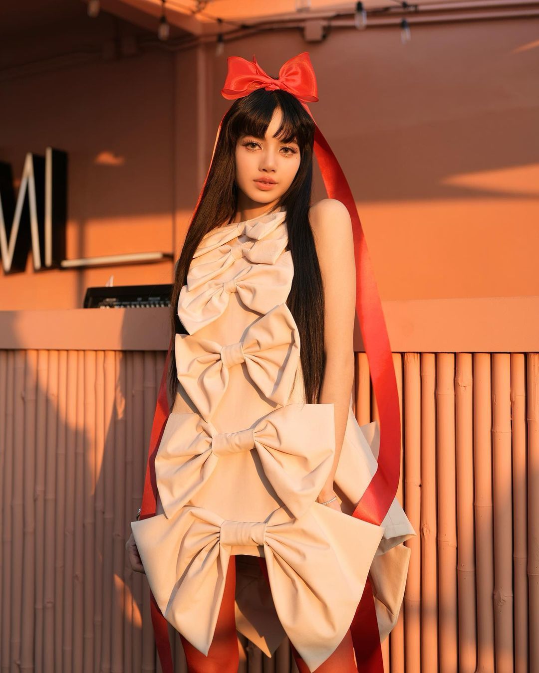 Trong một buổi biểu diễn, cô diện bộ quần áo vải tweed dệt kim tuyến, trang trí bằng họa tiết nơ 3D đính đá. Quần chẽn cạp cao - xu hướng hot của thế giới năm ngoái - giúp Lisa "kéo dài" chân hiệu quả. Để tránh sự cố, cô phối thêm crop top nhung đen bên trong.