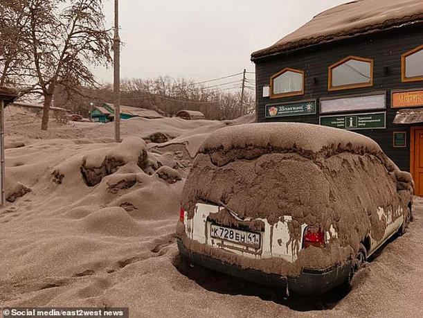 Tro bụi bao phủ một chiếc xe ô tô sau khi núi lửa phun trào ở Nga (Ảnh: Daily Mail)