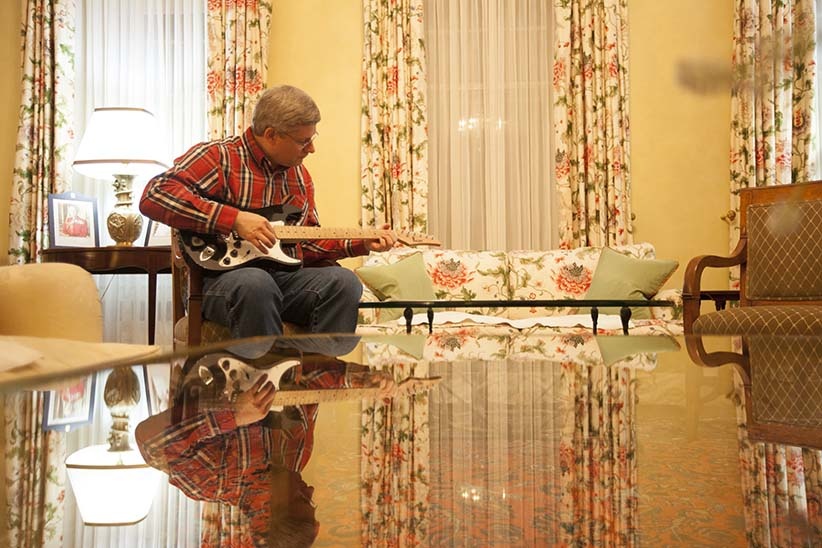 Thủ tướng Stephen Harper chơi guitar trong phòng khách của dinh thự số 24 Sussex, ngày 18/2/2011. Ảnh: Jason Ransom.