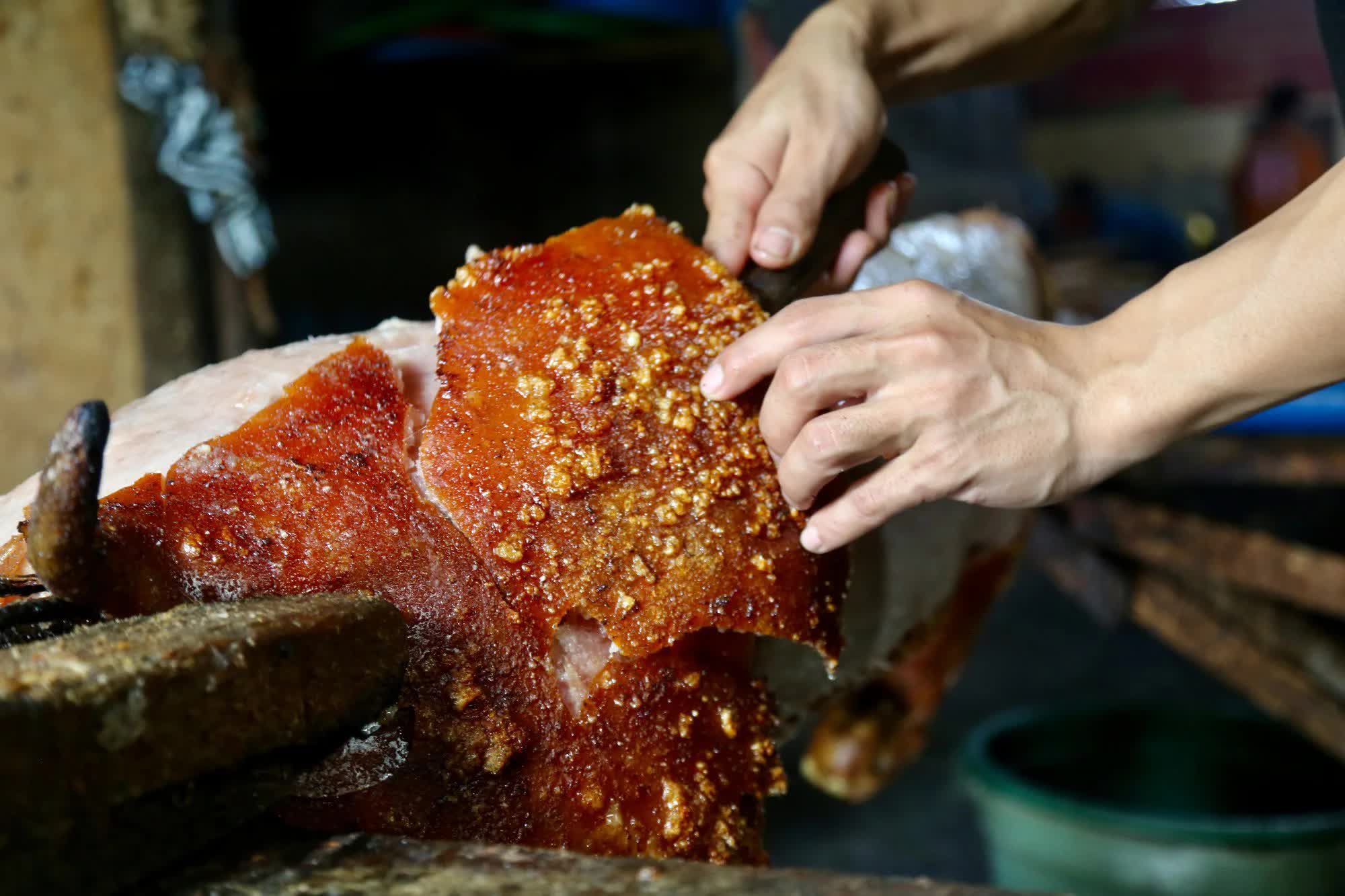 Sau đó, anh sẽ dành hàng giờ đồng hồ để quay lợn trong khi phết lớp da bên ngoài với hỗn hợp dầu dừa và nghệ cho đến khi da lợn chuyển sang màu nâu vàng và trở nên giòn rụm.