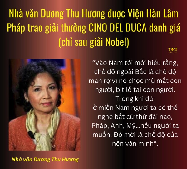 Không có bất kỳ cơ quan truyền thông chính thức nào tại Việt Nam đề cập đến sự kiện - ngày 21/4/2023, Ban Giám khảo “Cino-Del-Duca” công bố quyết định trao tặng giải năm nay cho bà Dương Thu Hương nhằm “tôn vinh một nhà văn lớn vì nhân cách và sự nghiệp xuất sắc, truyền đi thông điệp về chủ nghĩa nhân văn hiện đại” dẫu “Cino-Del-Duca” là một loại giải thưởng quan trọng, chỉ sau giải Nobel về Văn học.