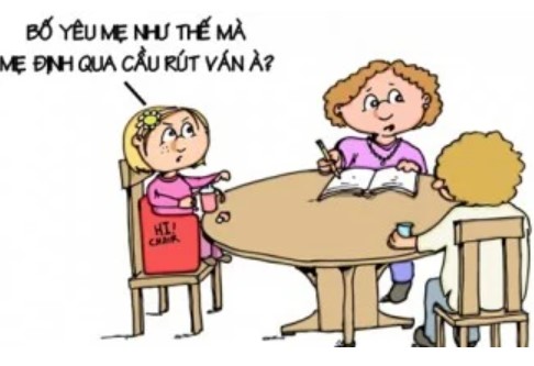Thấy bố im lặng không nói gì, cô con gái nhỏ liền chạy tới ôm chân mẹ, vẻ mặt rất nghiêm trọng nói: