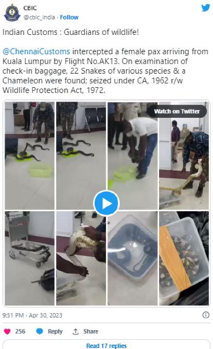 Theo đó, lực lượng hải quan sân bay Chennai của Ấn Độ cho biết người phụ nữ giấu tên đã nhét hơn 20 con rắn và một con tắc kè hoa vào trong vali ký gửi trên chuyến bay từ Kuala Lumpur, Malaysia tới vào ngày 28/4.