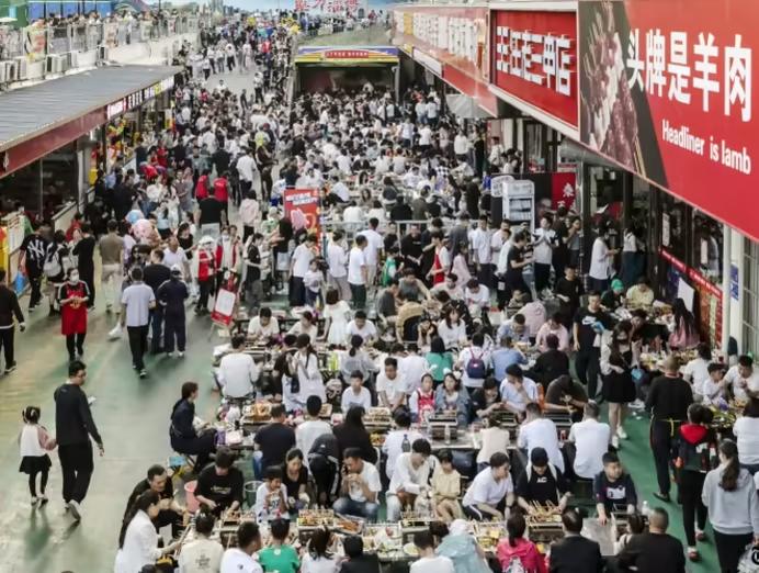 Đối với nhiều du khách, đám đông là một vấn đề sau khi Trung Quốc kéo dài phong tỏa do Covid-19. Để giảm thiểu tình trạng đông người, các quan chức thành phố đã xây dựng một đài quan sát trên cao để khách du lịch chờ và xem người bên dưới ăn. Bên dưới là hàng trăm thực khách ngồi trên những chiếc ghế đẩu xung quanh các lò nướng ngoài trời.