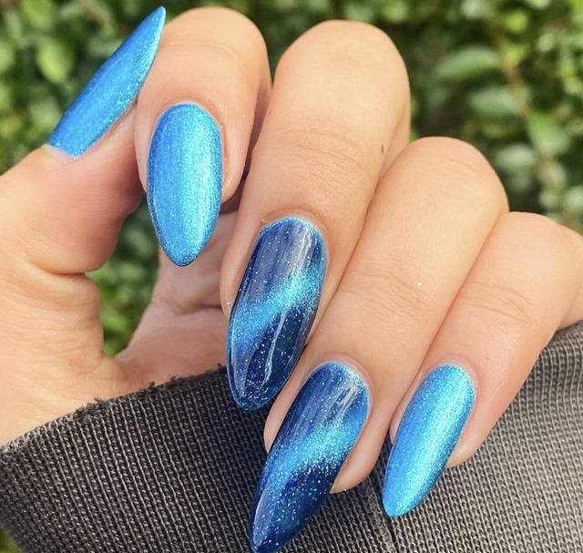 Màu xanh dương đứng đầu trong danh sách các mẫu nail mang âm hưởng đại dương. Để thêm hiệu ứng bắt mắt, bạn hãy hoàn thiện bộ móng bằng một lớp nhũ cùng tone và tạo ra các vệt sáng tương phản.