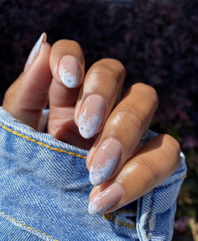 Việc sử dụng sơn đầu móng màu trắng tạo thành những cơn sóng xô đan xen màu xanh lam cùng những hạt nhũ lấp lánh là phiên bản nâng cấp của kiểu làm móng cổ điển kiểu Pháp.