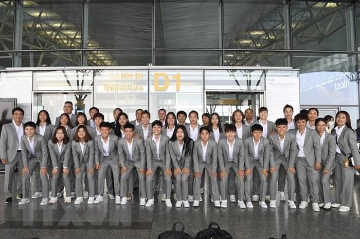Các tuyển thủ Nữ Việt Nam tại sân bay quốc tế Nội Bài. (Ảnh: TTXVN)