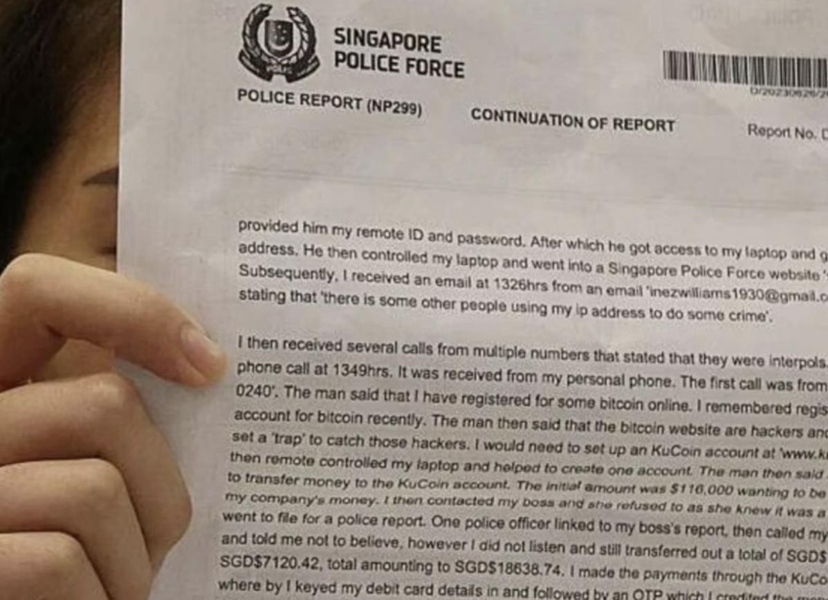 Nhưng người phụ nữ 35 tuổi, họ Li, đă bị lừa 18.000 SGD (hơn 300 triệu đồng), không nhờ rằng chính người được gọi là cảnh sát kia mới là kẻ dàn dựng tṛ lừa đảo.