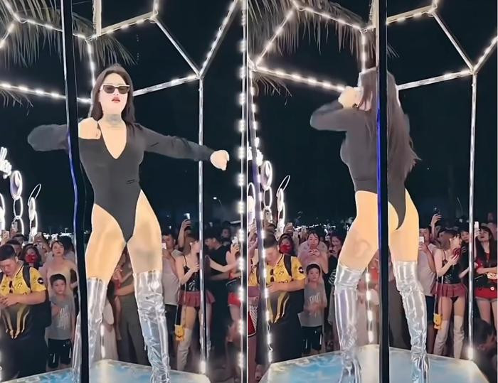 Cụ thể, trong đoạn clip, Ngân Baby mặc bodysuit màu đen bóng, thoải mái nhảy múa trên bục quán bar tại bãi biển Hạ Long. Phần trang phục kín trên hở dưới của cô nàng khiến một số người cảm thấy nhức mắt, phản cảm, đặc biệt khi đây là địa điểm vui chơi công cộng có đông trẻ em qua lại.