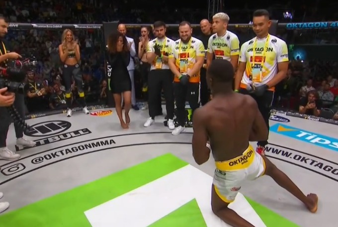 Keita cầu hôn bạn gái trong lồng bát giác sau khi thua Sanikidze. Ảnh: chụp màn hình