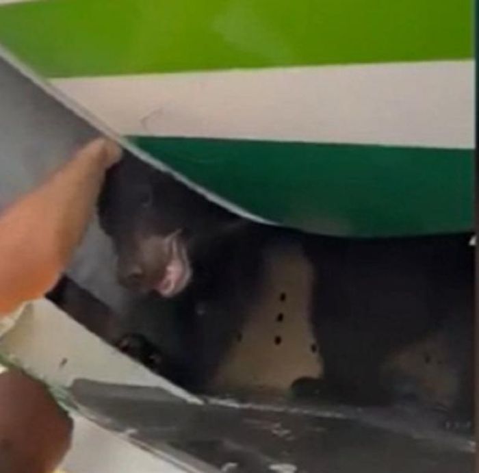 Trong một video khác, một gấu con đã xuất hiện và đi lại quanh chuồng trên máy bay, trong khi nhiều người cố gắng xoa dịu nó.