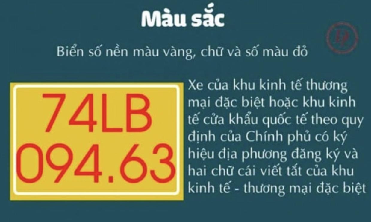 Biển số nền màu vàng, chữ và số màu đỏ, có ký hiệu địa phương đăng ký và hai chữ cái viết tắt của khu kinh tế - thương mại đặc biệt, khu kinh tế cửa khẩu quốc tế, cấp cho xe của khu kinh tế - thương mại đặc biệt hoặc khu kinh tế cửa khẩu quốc tế theo quy định của Chính phủ.