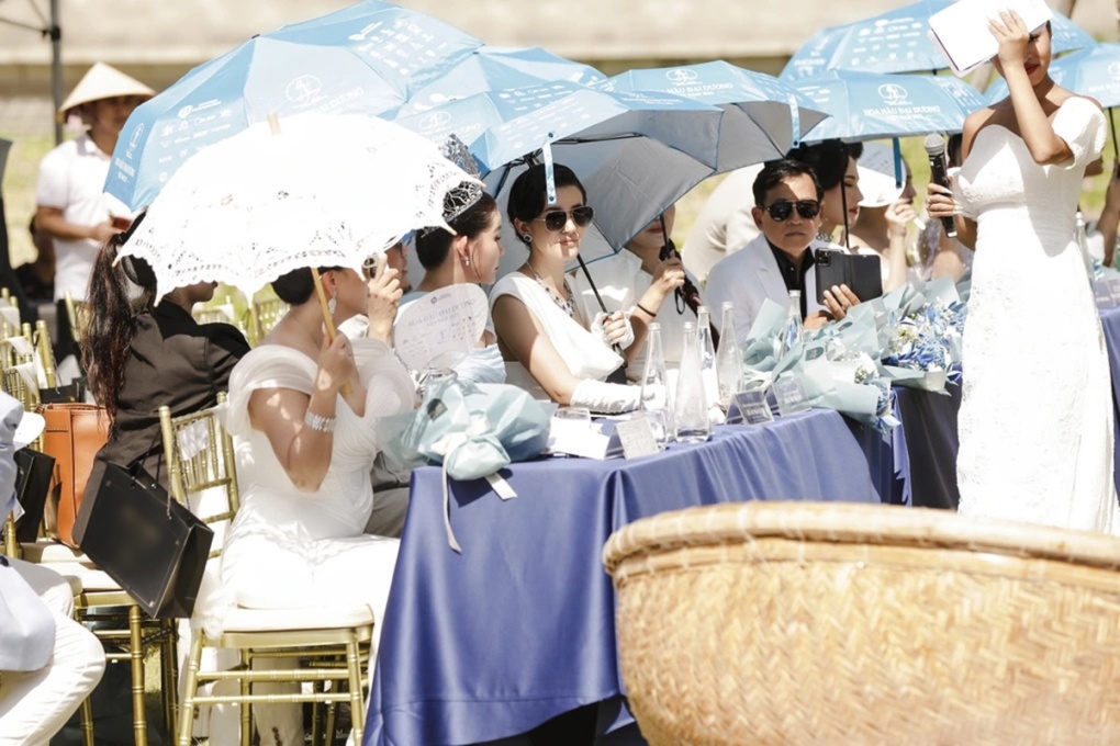 Ban giám khảo dùng ô che nắng suốt ba tiếng chấm thi. Ảnh: BTC