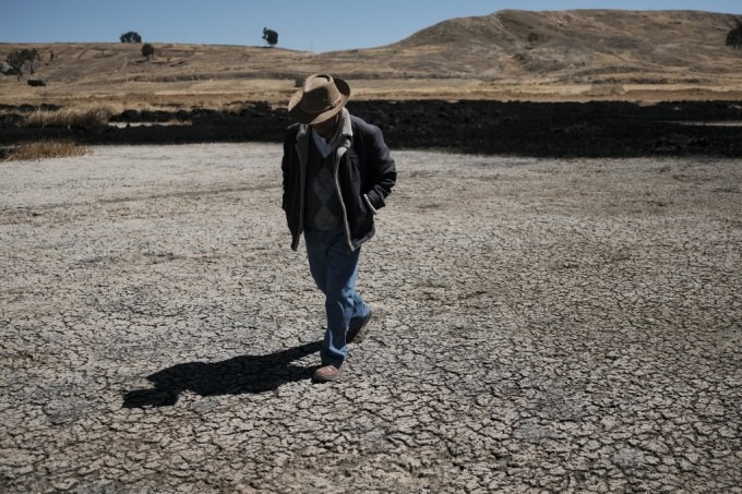 Người đàn ông đi bộ trên mặt đất nứt nẻ ở hồ Titicaca ngày 17/8. Ảnh: AFP