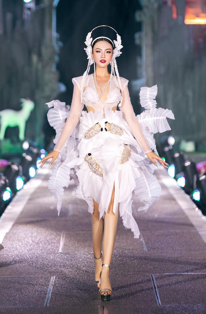 Theo đó, Á hậu 2 Hoa hậu Hoàn vũ Việt Nam 2022 diện thiết kế mô phỏng chiếc đèn lồng con cá từng là tuổi thơ của nhiều thế hệ người Việt. Chia sẻ với Dân Việt, NTK Kiên Vũ cho hay: "Bộ trang phục sử chất liệu organza trong suốt, đan chéo thủ công mang đặc trưng của những làng nghề đan lát Việt Nam. Điểm nhấn của thiết kế là chi tiết con cá được đính kết tỉ mỉ như những tia sáng của đèn lồng".